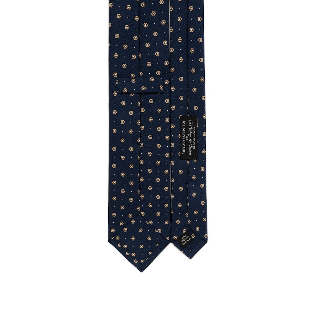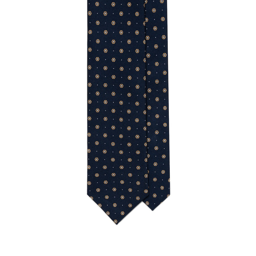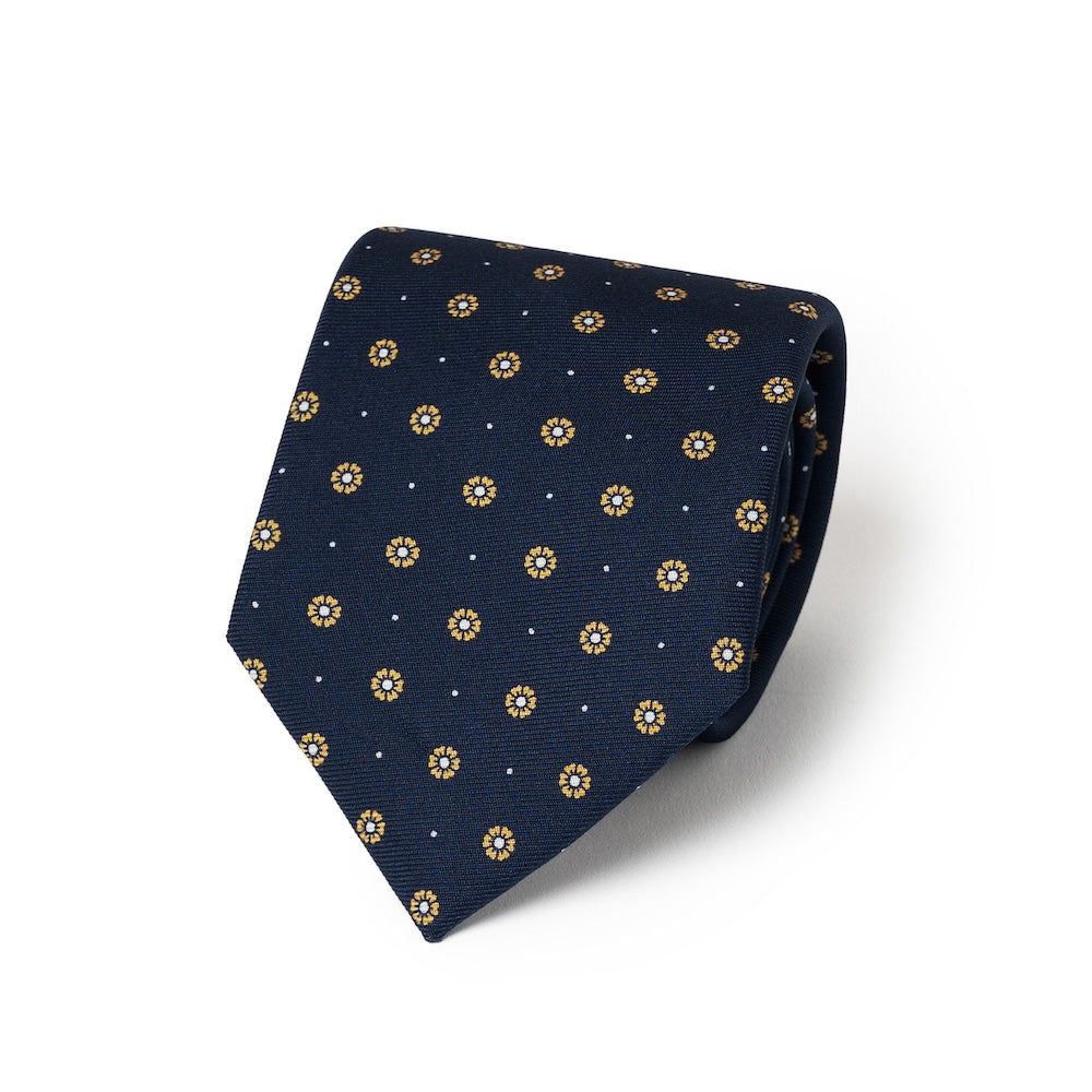 Brown & Yellow Petite Flower Pattern Dark Navy Printed Silk Tie