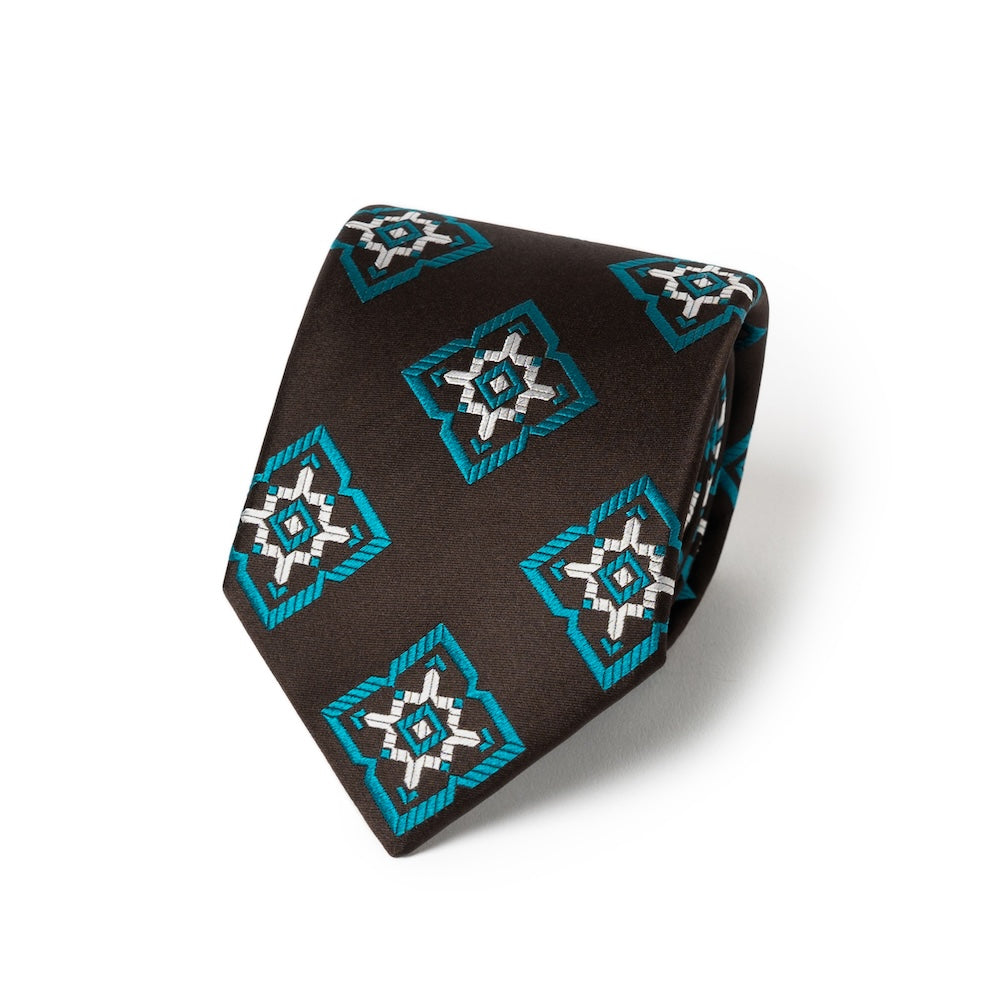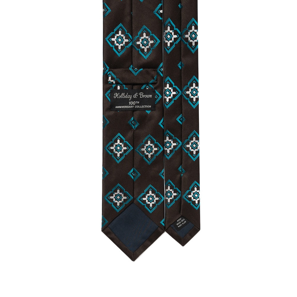 100th Anniversary Medallion Pattern Dark Brown Satin Woven Silk Tie