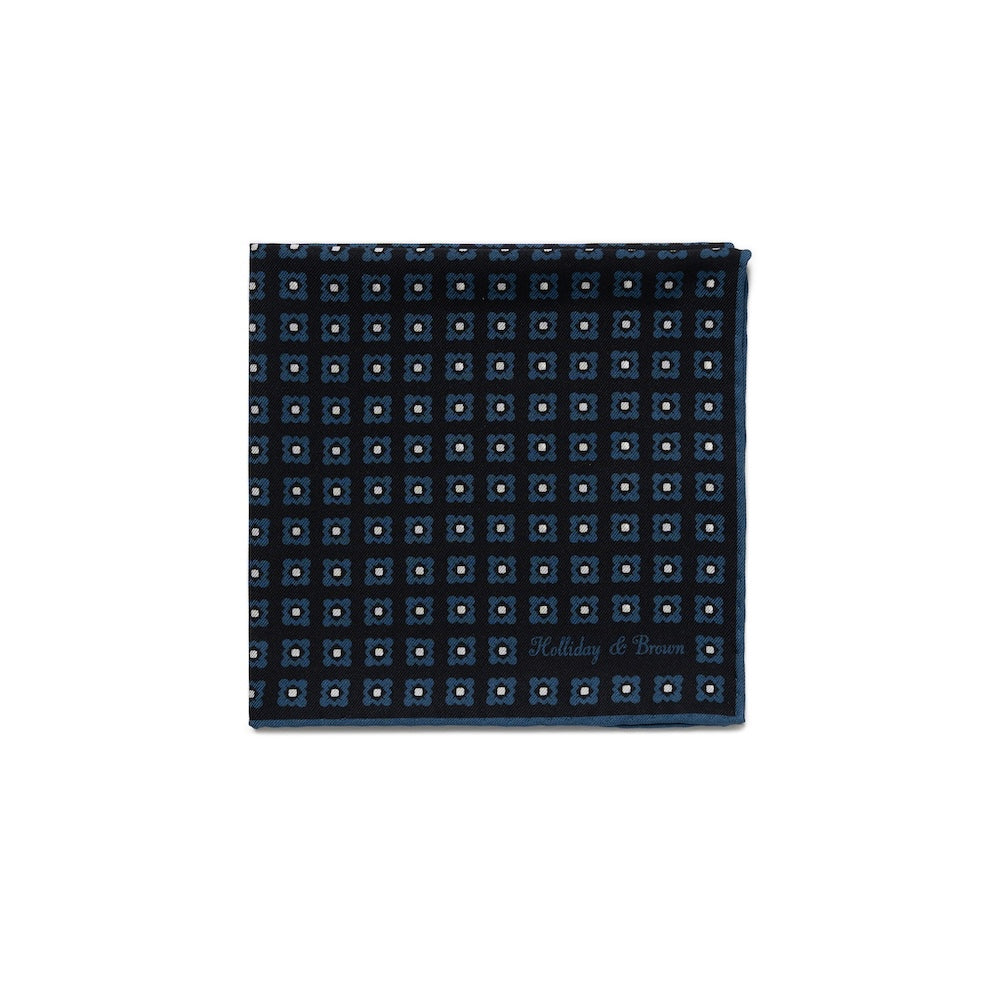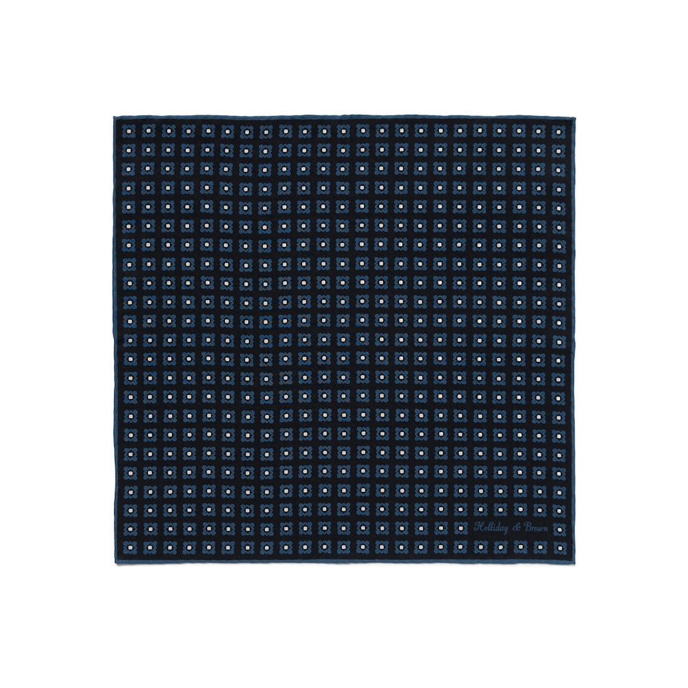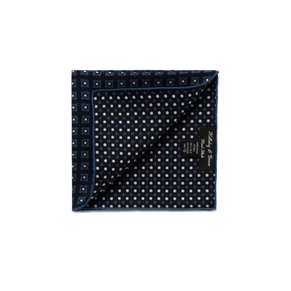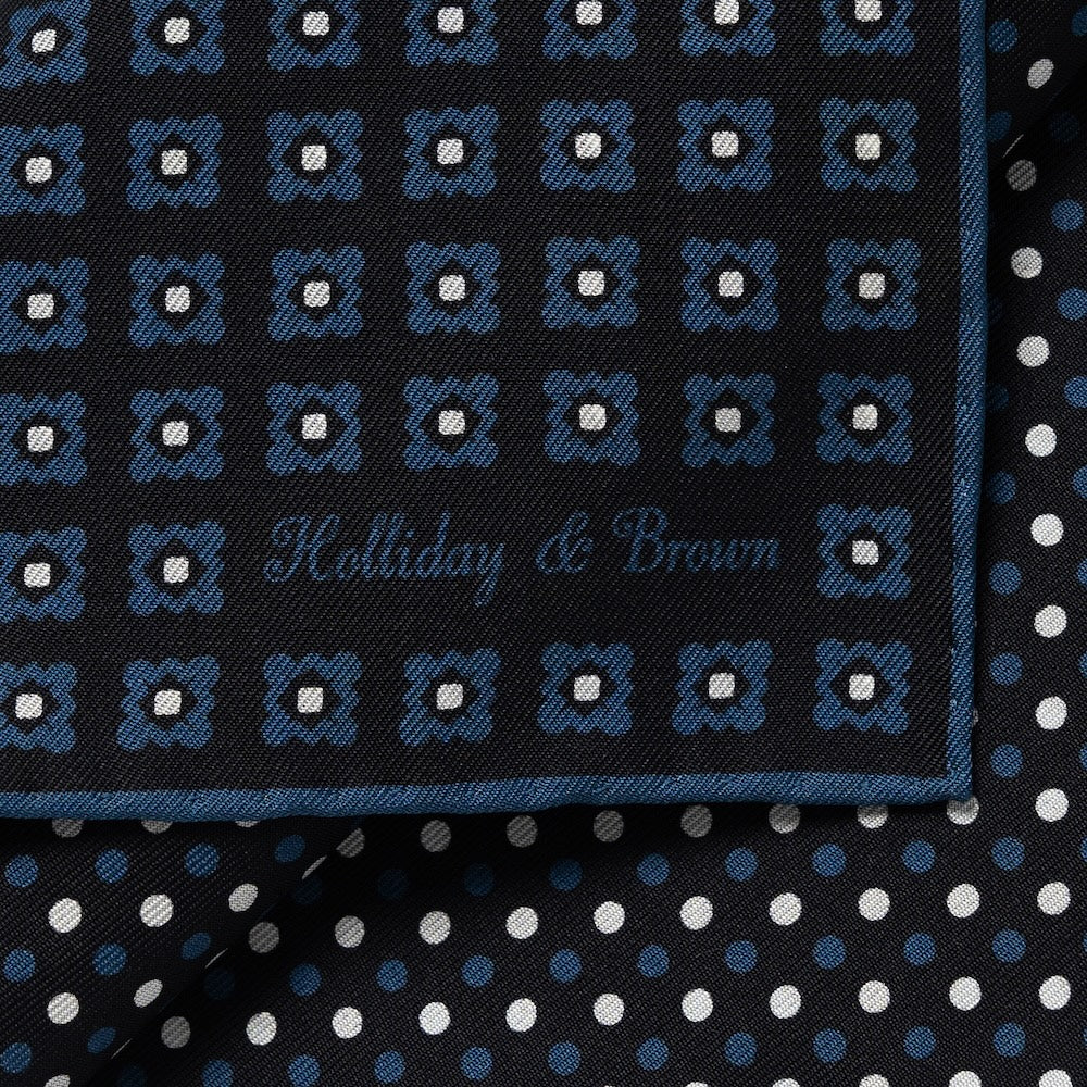 Flower & Multi-Dot Pattern Double-Face Navy Blue Printed Silk Pocket Square
